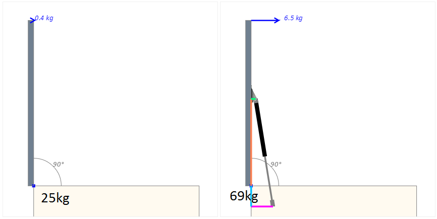 The cause of the higher forces is the fact that the gas spring generally works over a shorter moment arm of force. To be able to carry the entire moment of force of the cover a larger force is therefore required. The gas spring therefore also has an extension force which is much greater than the weight of the cover. In this example, the gas strut has an extension force of up to 420N or 43kg. This is a lot more than the 25kg weight of the cover.