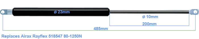 Replacement gas spring for the Airax Rayflex 518547 80-1250 Newton. Mounting part tube: The eye has a thickness of 5mm and a hole diameter of 8.1mm. Mounting part rod : The eye has a thickness of 10mm and a hole diameter of 8.1mm. Brand: HAHN, a Stabilus company.
