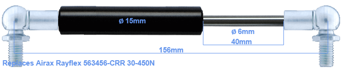 Replacement gas spring for the Airax Rayflex 563456-CRR 30-450 Newton. This fits a (possibly already present) ball with a diameter of 10mm. A corresponding ball is included. Brand: HAHN, a Stabilus company.