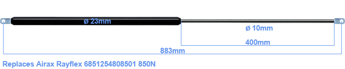 Replacement gas spring for the Airax Rayflex 6851254808501 850 Newton. The eye has a thickness of 10mm and a hole diameter of 8.1mm. Brand: HAHN, a Stabilus company.