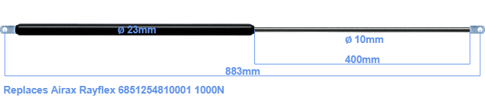 Replacement gas spring for the Airax Rayflex 6851254810001 1000 Newton. The eye has a thickness of 10mm and a hole diameter of 8.1mm. Brand: HAHN, a Stabilus company.