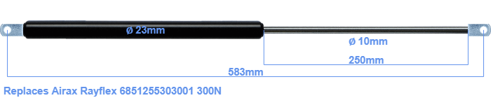 Replacement gas spring for the Airax Rayflex 6851255303001 300 Newton. The eye has a thickness of 10mm and a hole diameter of 8.1mm. Brand: HAHN, a Stabilus company.