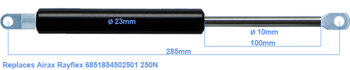 Replacement gas spring for the Airax Rayflex 6851854502501 250 Newton. Mounting part tube: The eye has a thickness of 5mm and a hole diameter of 8.1mm. Mounting part rod : The eye has a thickness of 10mm and a hole diameter of 8.1mm. Brand: HAHN, a Stabilus company.