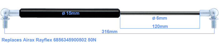 Replacement gas spring for the Airax Rayflex 6856345900502 50 Newton. This fits a (possibly already present) ball with a diameter of 10mm. A corresponding ball is included. Brand: HAHN, a Stabilus company.