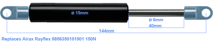 Replacement gas spring for the Airax Rayflex 6856350101501 150 Newton. The eye has a thickness of 3mm and a hole diameter of 6.1mm. Brand: HAHN, a Stabilus company.