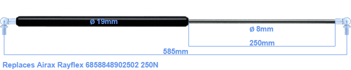 Replacement gas spring for the Airax Rayflex 6858848902502 250 Newton. This fits a (possibly already present) ball with a diameter of 10mm. A corresponding ball is included. Brand: HAHN, a Stabilus company.