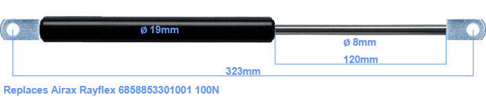 Replacement gas spring for the Airax Rayflex 6858853301001 100 Newton. The eye has a thickness of 10mm and a hole diameter of 8.1mm. Brand: HAHN, a Stabilus company.