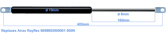 Replacement gas spring for the Airax Rayflex 6858853505001 500 Newton. The eye has a thickness of 10mm and a hole diameter of 8.1mm. Brand: HAHN, a Stabilus company.