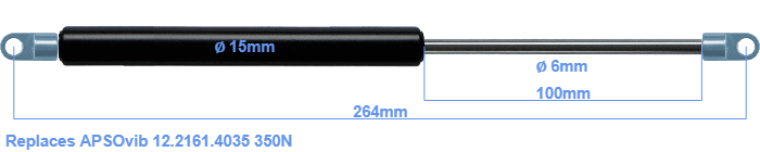 Replacement gas spring for the APSOvib 12.2161.4035 350 Newton. The eye has a thickness of 3mm and a hole diameter of 6.1mm. Brand: HAHN, a Stabilus company.