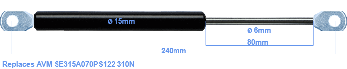 Replacement gas spring for the AVM SE315A070PS122 310 Newton. The eye has a thickness of 10mm and a hole diameter of 8.1mm. Brand: HAHN, a Stabilus company.