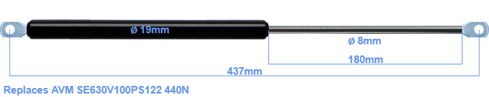 Replacement gas spring for the AVM SE630V100PS122 440 Newton. The eye has a thickness of 10mm and a hole diameter of 8.1mm. Brand: HAHN, a Stabilus company.