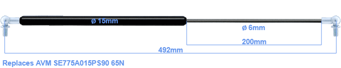 Replacement gas spring for the AVM SE775A015PS90 65 Newton. This fits a (possibly already present) ball with a diameter of 10mm. A corresponding ball is included. Brand: HAHN, a Stabilus company.