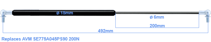 Replacement gas spring for the AVM SE775A045PS90 200 Newton. This fits a (possibly already present) ball with a diameter of 10mm. A corresponding ball is included. Brand: HAHN, a Stabilus company.