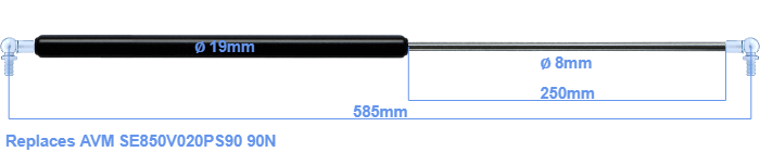 Replacement gas spring for the AVM SE850V020PS90 90 Newton. This fits a (possibly already present) ball with a diameter of 10mm. A corresponding ball is included. Brand: HAHN, a Stabilus company.