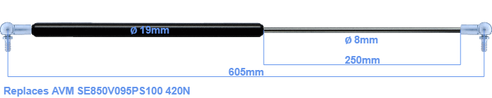Replacement gas spring for the AVM SE850V095PS100 420 Newton. This fits a (possibly already present) ball with a diameter of 13mm. A corresponding ball is included. Brand: HAHN, a Stabilus company.