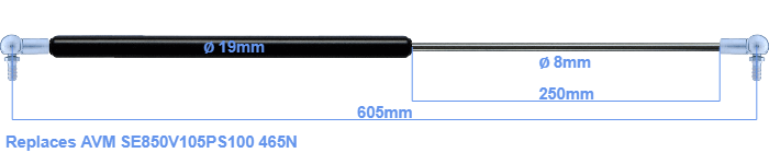 Replacement gas spring for the AVM SE850V105PS100 465 Newton. This fits a (possibly already present) ball with a diameter of 13mm. A corresponding ball is included. Brand: HAHN, a Stabilus company.