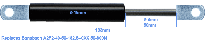 Replacement gas spring for the Bansbach A2F2-40-50-182,5--0XX 50-800 Newton. The eye has a thickness of 10mm and a hole diameter of 8.1mm. Brand: HAHN, a Stabilus company.