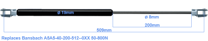 Replacement gas spring for the Bansbach A5A5-40-200-512--0XX 50-800 Newton. The fork has a hole diameter of 8.1mm. Brand: HAHN, a Stabilus company.