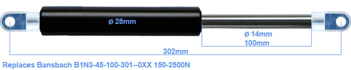 Replacement gas spring for the Bansbach B1N3-45-100-301--0XX 150-2500 Newton. The eye has a thickness of 10mm and a hole diameter of 8.1mm. Brand: HAHN, a Stabilus company.