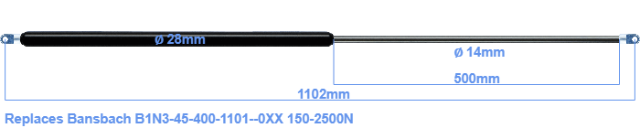 Replacement gas spring for the Bansbach B1N3-45-400-1101--0XX 150-2500 Newton. The eye has a thickness of 10mm and a hole diameter of 8.1mm. Brand: HAHN, a Stabilus company.