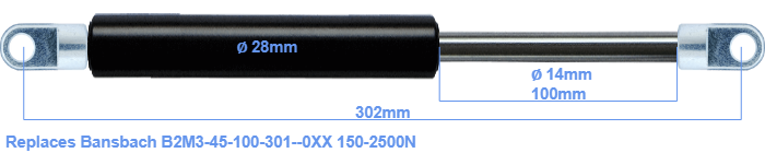 Replacement gas spring for the Bansbach B2M3-45-100-301--0XX 150-2500 Newton. The eye has a thickness of 10mm and a hole diameter of 10.1mm. Brand: HAHN, a Stabilus company.