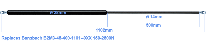 Replacement gas spring for the Bansbach B2M3-45-400-1101--0XX 150-2500 Newton. The eye has a thickness of 10mm and a hole diameter of 10.1mm. Brand: HAHN, a Stabilus company.