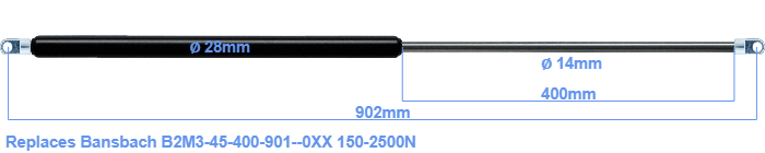 Replacement gas spring for the Bansbach B2M3-45-400-901--0XX 150-2500 Newton. The eye has a thickness of 10mm and a hole diameter of 10.1mm. Brand: HAHN, a Stabilus company.