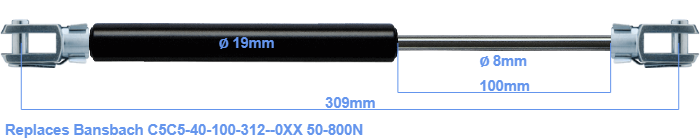 Replacement gas spring for the Bansbach C5C5-40-100-312--0XX 50-800 Newton. The fork has a hole diameter of 8.1mm. Brand: HAHN, a Stabilus company.