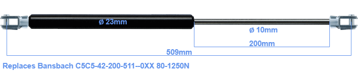 Replacement gas spring for the Bansbach C5C5-42-200-511--0XX 80-1250 Newton. The fork has a hole diameter of 8.1mm. Brand: HAHN, a Stabilus company.