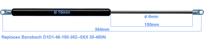 Replacement gas spring for the Bansbach D1D1-46-150-362--0XX 30-450 Newton. The eye has a thickness of 3mm and a hole diameter of 6.1mm. Brand: HAHN, a Stabilus company.