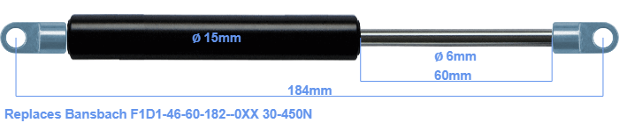 Replacement gas spring for the Bansbach F1D1-46-60-182--0XX 30-450 Newton. The eye has a thickness of 3mm and a hole diameter of 6.1mm. Brand: HAHN, a Stabilus company.