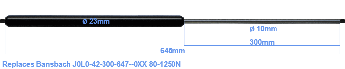 Replacement gas spring for the Bansbach J0L0-42-300-647--0XX 80-1250 Newton. Thread: M8. Brand: HAHN, a Stabilus company.
