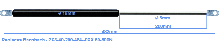 Replacement gas spring for the Bansbach J2X3-40-200-484--0XX 50-800 Newton. The eye has a thickness of 10mm and a hole diameter of 8.1mm. Brand: HAHN, a Stabilus company.