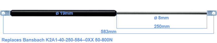 Replacement gas spring for the Bansbach K2A1-40-250-584--0XX 50-800 Newton. The eye has a thickness of 10mm and a hole diameter of 8.1mm. Brand: HAHN, a Stabilus company.