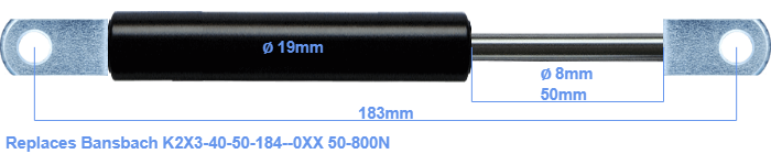 Replacement gas spring for the Bansbach K2X3-40-50-184--0XX 50-800 Newton. The eye has a thickness of 10mm and a hole diameter of 8.1mm. Brand: HAHN, a Stabilus company.