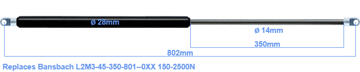 Replacement gas spring for the Bansbach L2M3-45-350-801--0XX 150-2500 Newton. The eye has a thickness of 10mm and a hole diameter of 10.1mm. Brand: HAHN, a Stabilus company.