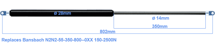 Replacement gas spring for the Bansbach N2N2-55-350-800--0XX 150-2500 Newton. The eye has a thickness of 10mm and a hole diameter of 8.1mm. Brand: HAHN, a Stabilus company.