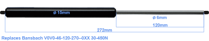 Replacement gas spring for the Bansbach V0V0-46-120-270--0XX 30-450 Newton. Thread: M5. Brand: HAHN, a Stabilus company.