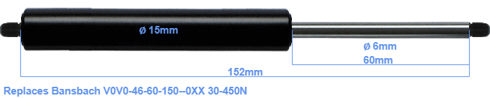 Replacement gas spring for the Bansbach V0V0-46-60-150--0XX 30-450 Newton. Thread: M5. Brand: HAHN, a Stabilus company.