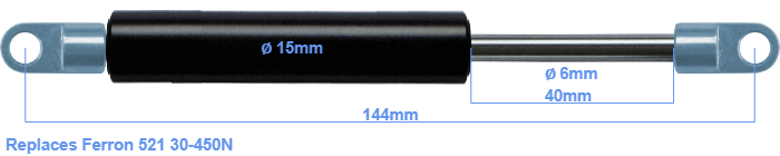 Replacement gas spring for the Ferron 521 30-450 Newton. The eye has a thickness of 3mm and a hole diameter of 6.1mm. Brand: HAHN, a Stabilus company.
