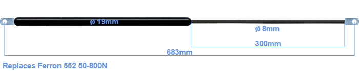 Replacement gas spring for the Ferron 552 50-800 Newton. The eye has a thickness of 10mm and a hole diameter of 8.1mm. Brand: HAHN, a Stabilus company.