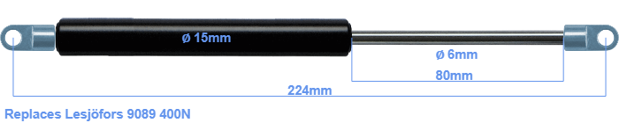 Replacement gas spring for the Lesjöfors 9089 400 Newton. The eye has a thickness of 3mm and a hole diameter of 6.1mm. Brand: HAHN, a Stabilus company.