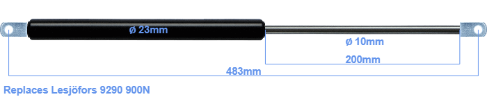 Replacement gas spring for the Lesjöfors 9290 900 Newton. The eye has a thickness of 10mm and a hole diameter of 8.1mm. Brand: HAHN, a Stabilus company.