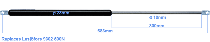 Replacement gas spring for the Lesjöfors 9302 500 Newton. The eye has a thickness of 10mm and a hole diameter of 8.1mm. Brand: HAHN, a Stabilus company.