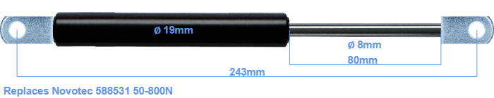 Replacement gas spring for the Novotec 588531 50-800 Newton. The eye has a thickness of 10mm and a hole diameter of 8.1mm. Brand: HAHN, a Stabilus company.