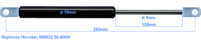Replacement gas spring for the Novotec 588532 50-800 Newton. The eye has a thickness of 10mm and a hole diameter of 8.1mm. Brand: HAHN, a Stabilus company.