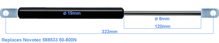 Replacement gas spring for the Novotec 588533 50-800 Newton. The eye has a thickness of 10mm and a hole diameter of 8.1mm. Brand: HAHN, a Stabilus company.