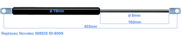 Replacement gas spring for the Novotec 588535 50-800 Newton. The eye has a thickness of 10mm and a hole diameter of 8.1mm. Brand: HAHN, a Stabilus company.