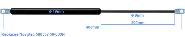 Replacement gas spring for the Novotec 588537 50-800 Newton. The eye has a thickness of 10mm and a hole diameter of 8.1mm. Brand: HAHN, a Stabilus company.