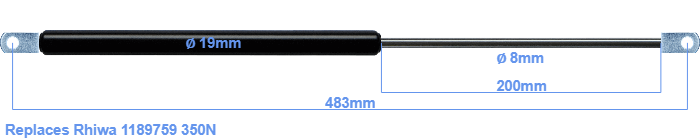 Replacement gas spring for the Rhiwa 1189759 350 Newton. The eye has a thickness of 10mm and a hole diameter of 8.1mm. Brand: HAHN, a Stabilus company.